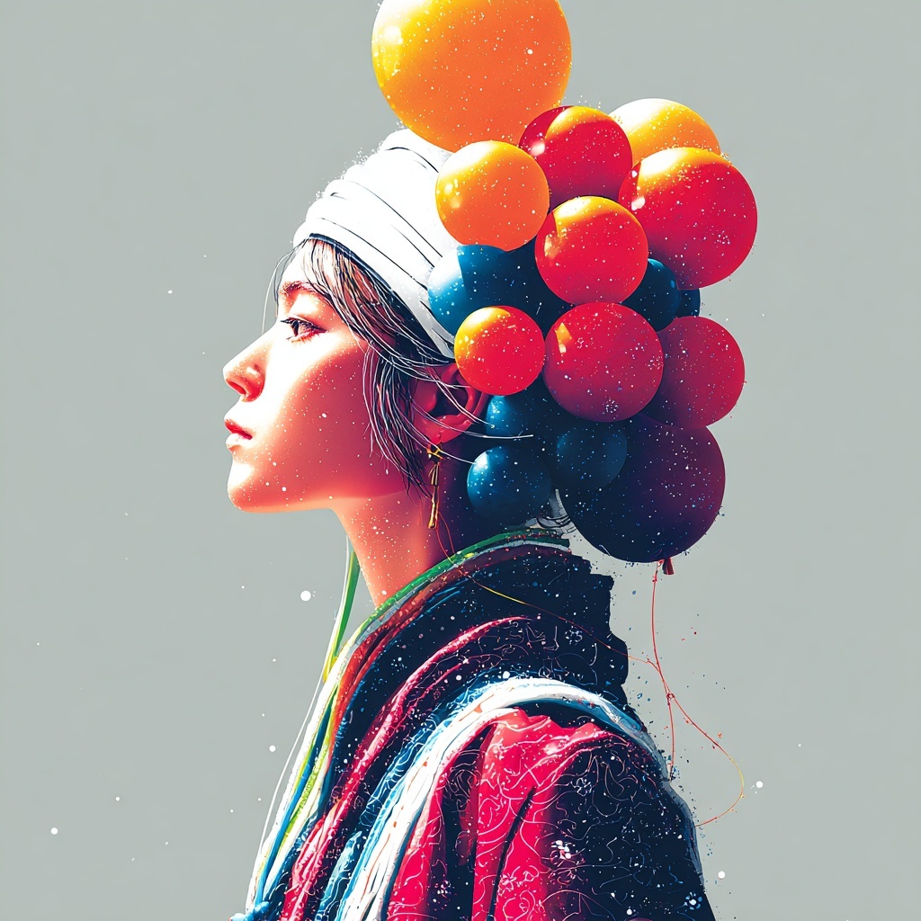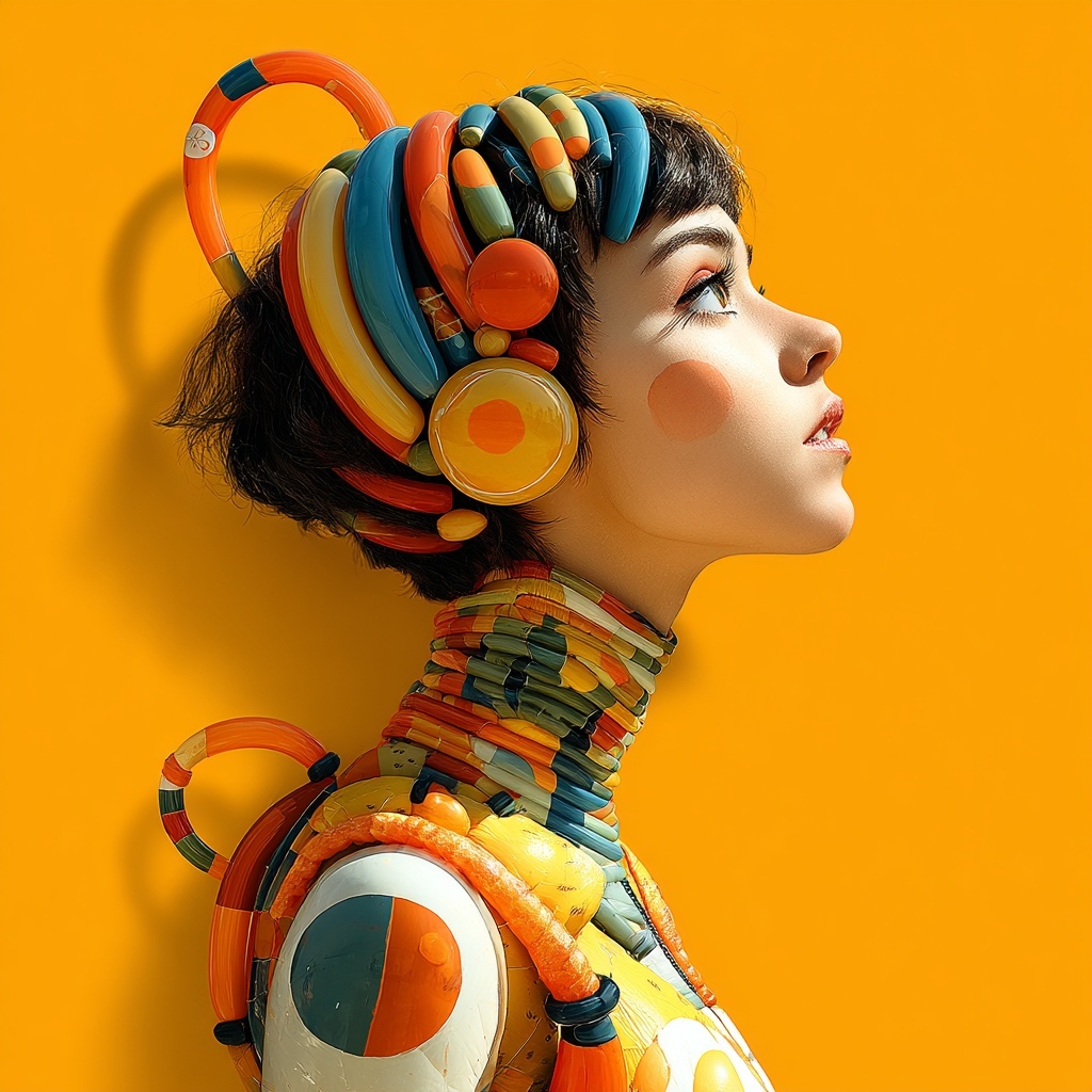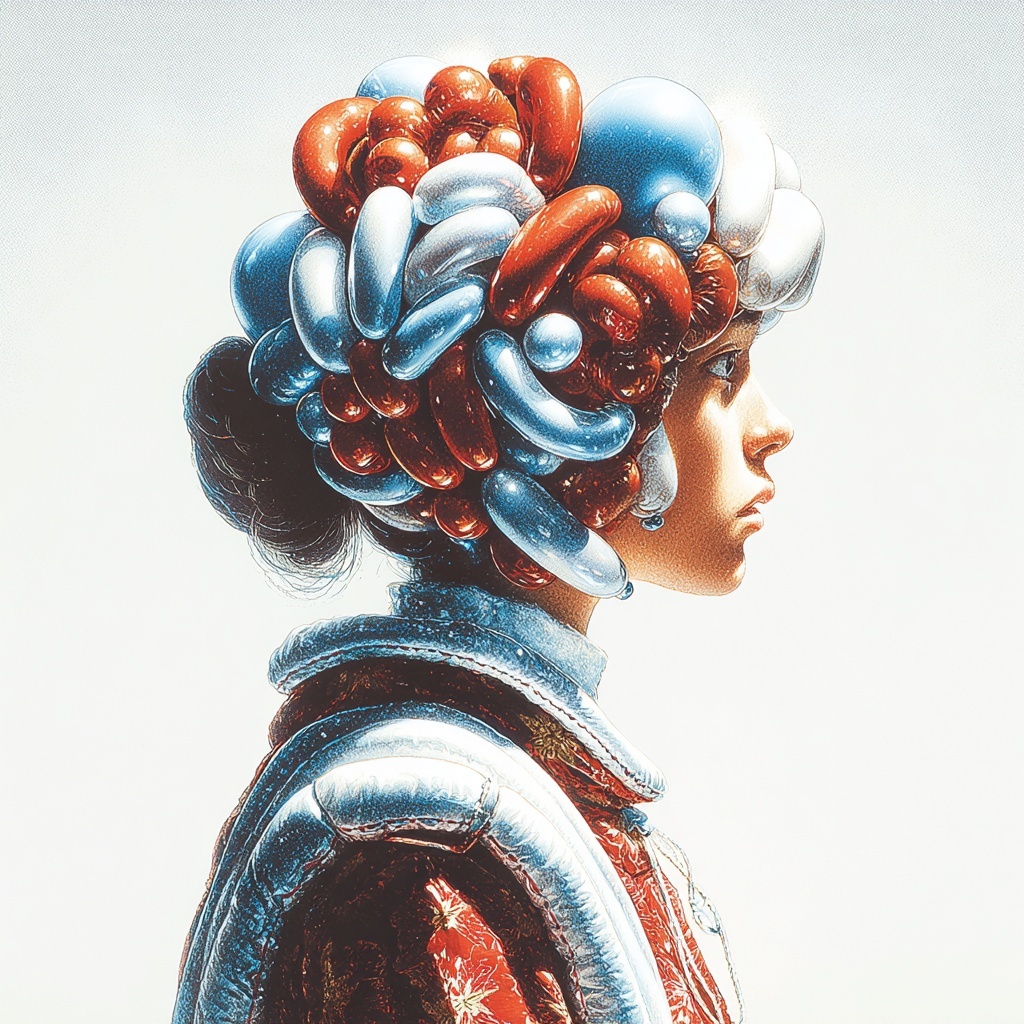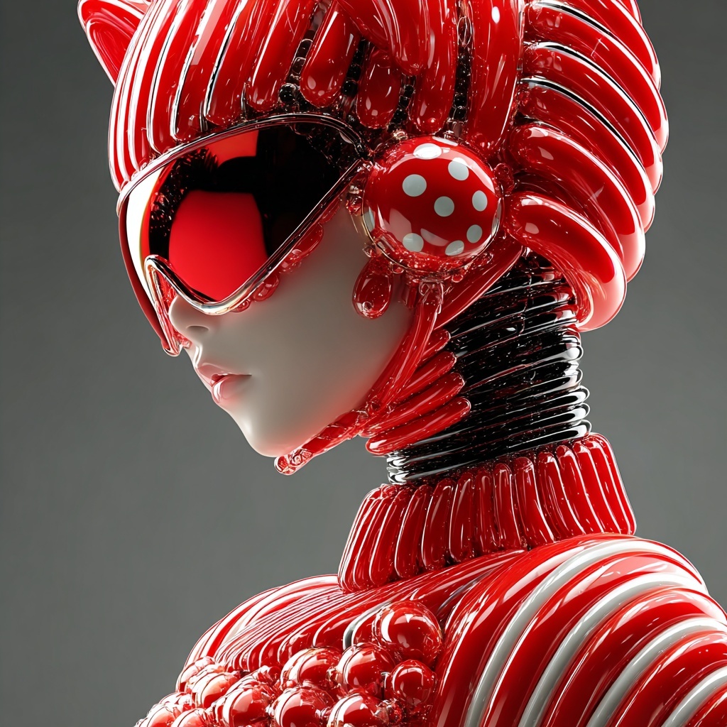 This style reshapes subjects with glossy, balloon-like forms that resemble playful sculptures or elaborate headpieces.