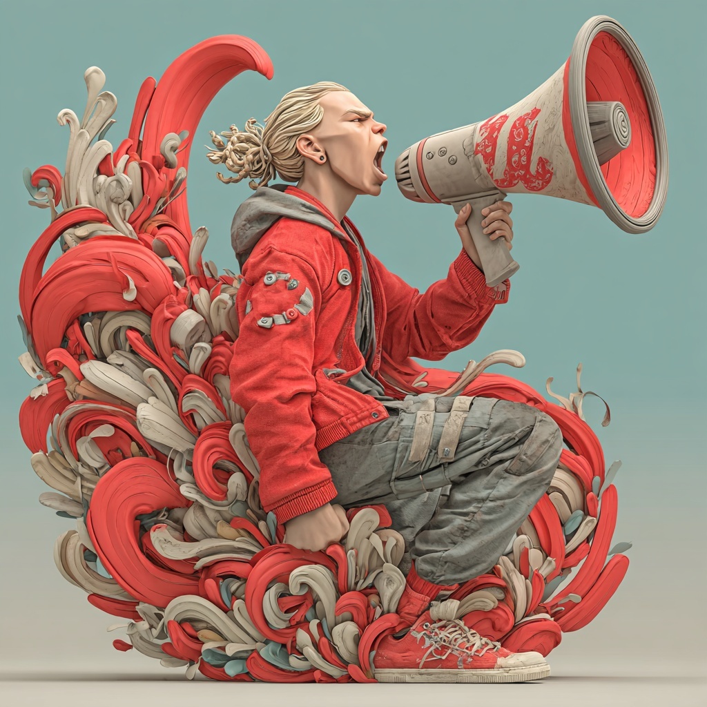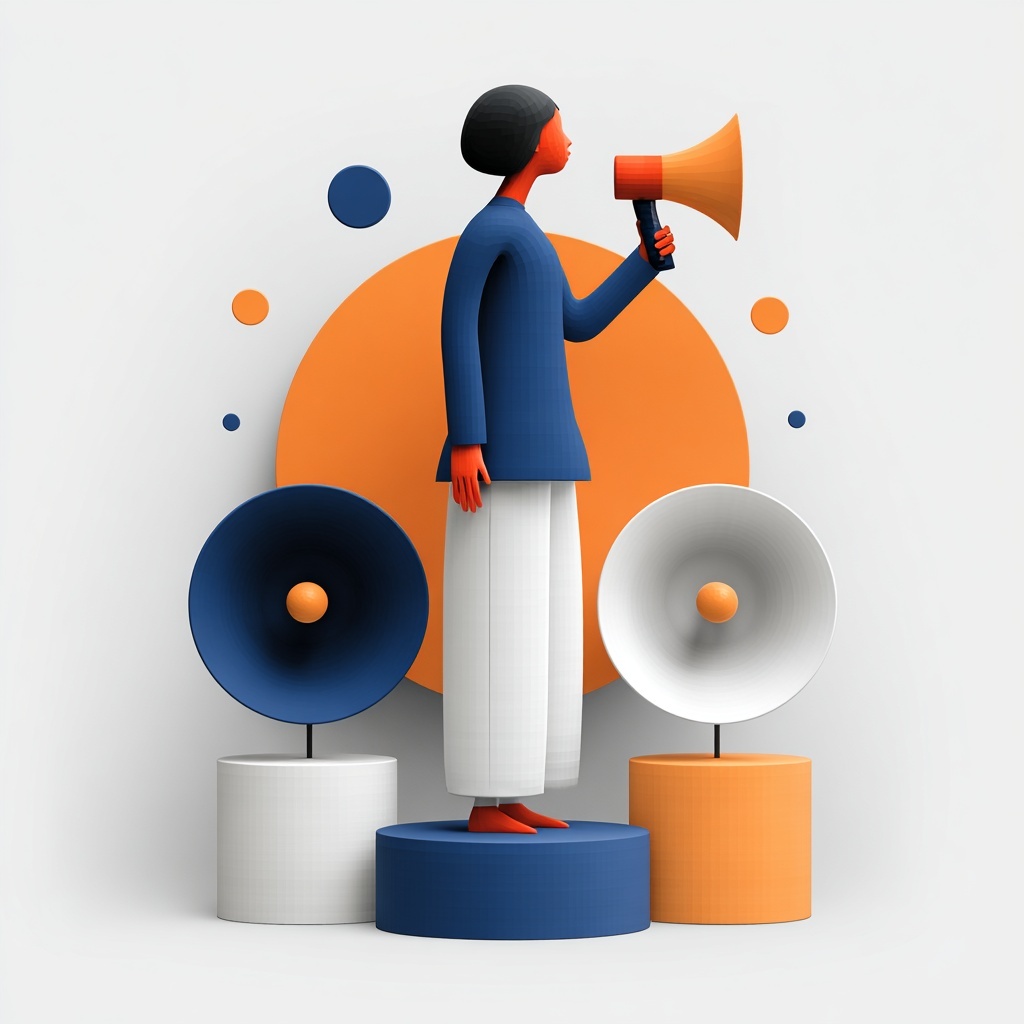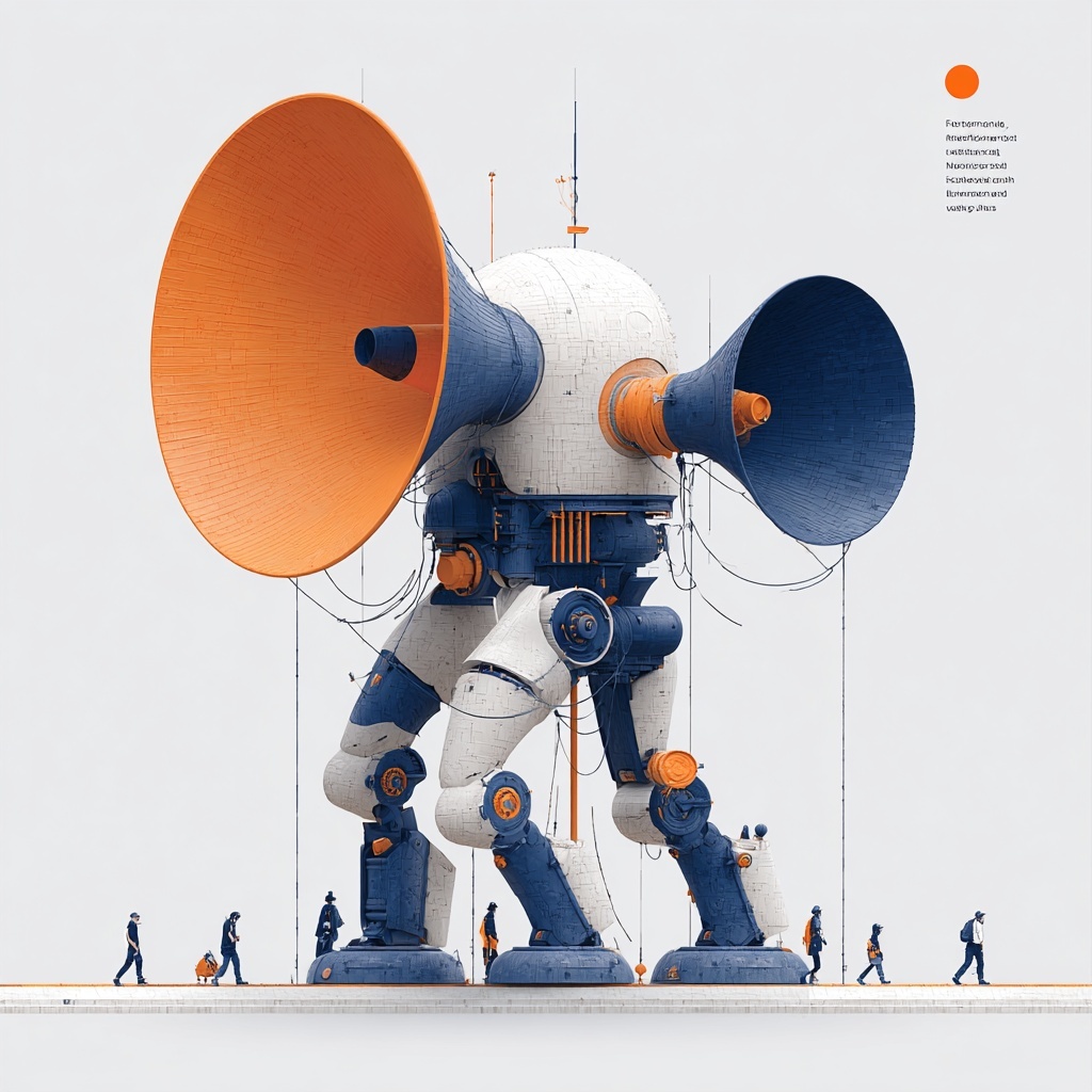 Use a civic-media metaphor bank: podium forms, public-address funnels, and relay channels reshape the subject’s voice before it reaches listeners.