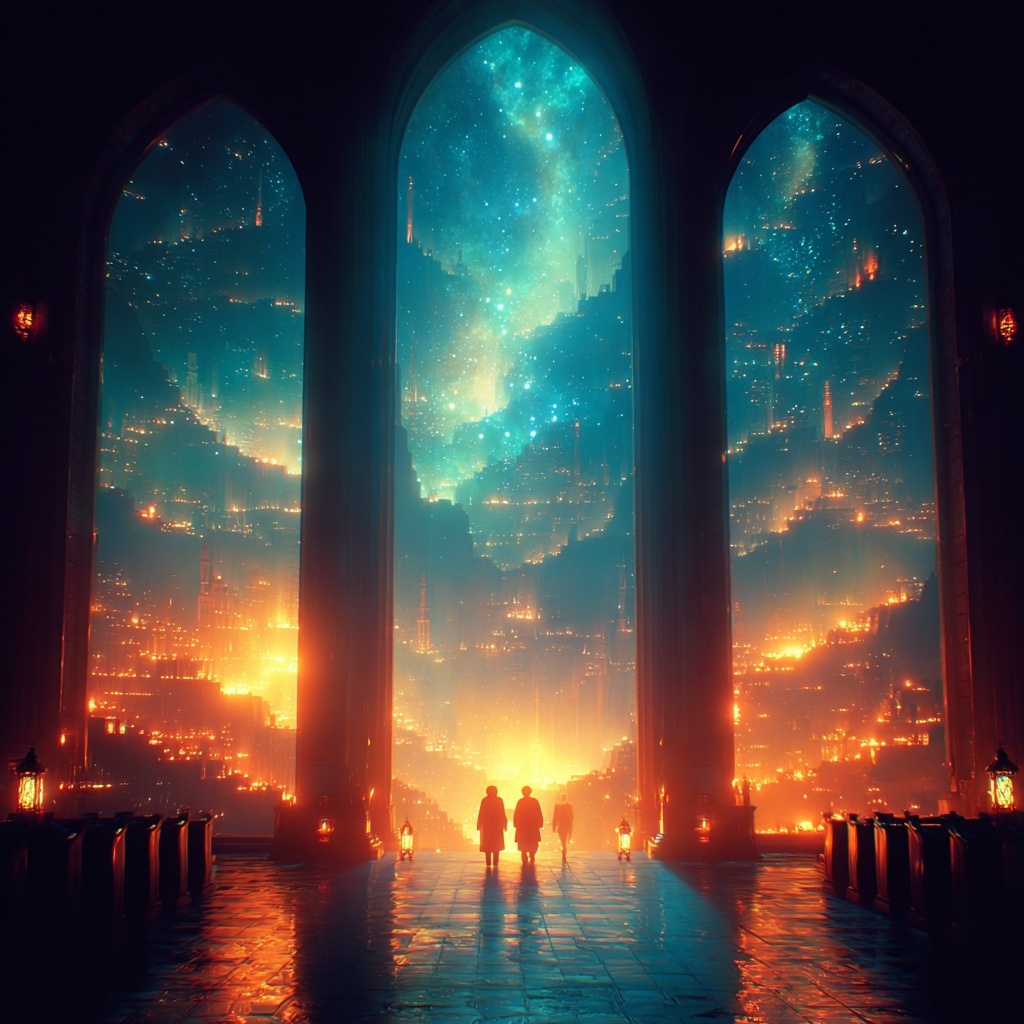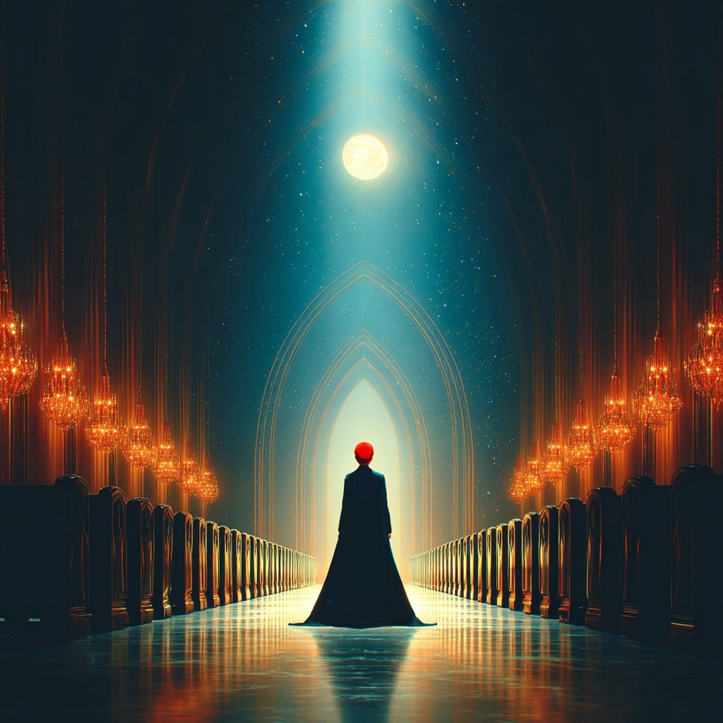 Cathedral of Sleep Styles transforms the subject into monumental dream architecture — vaulted halls, floating pews, and chandeliers made of mist