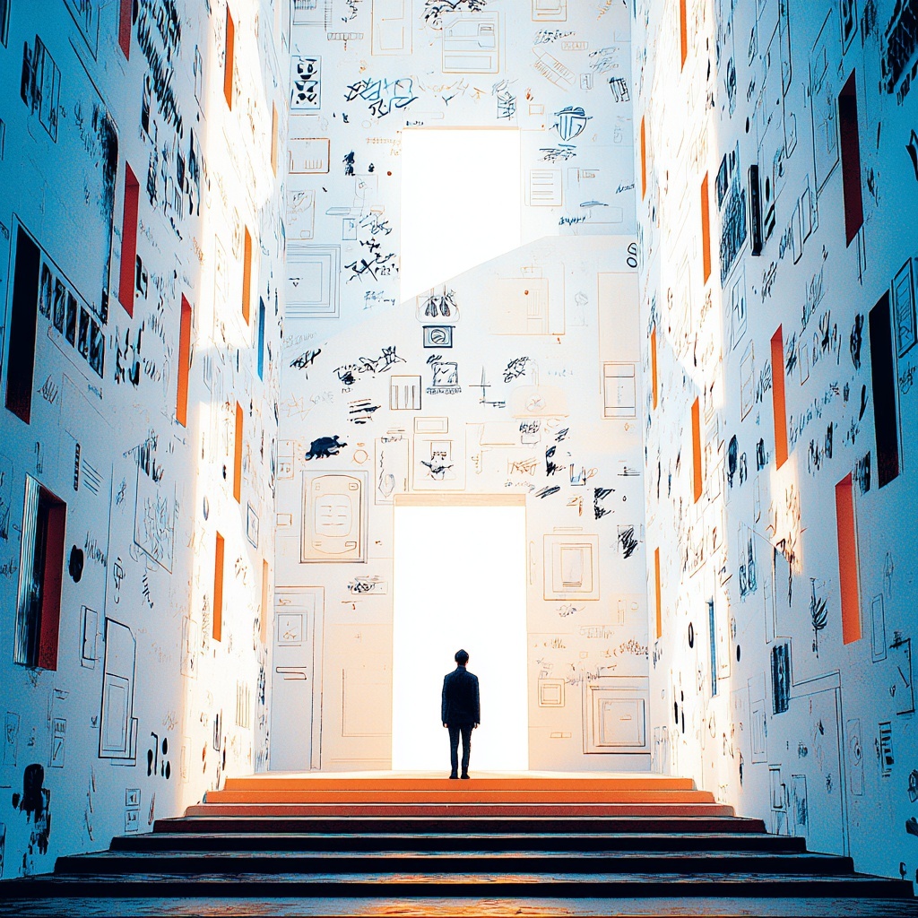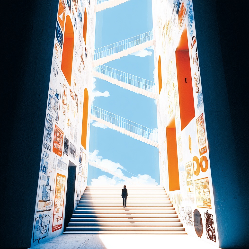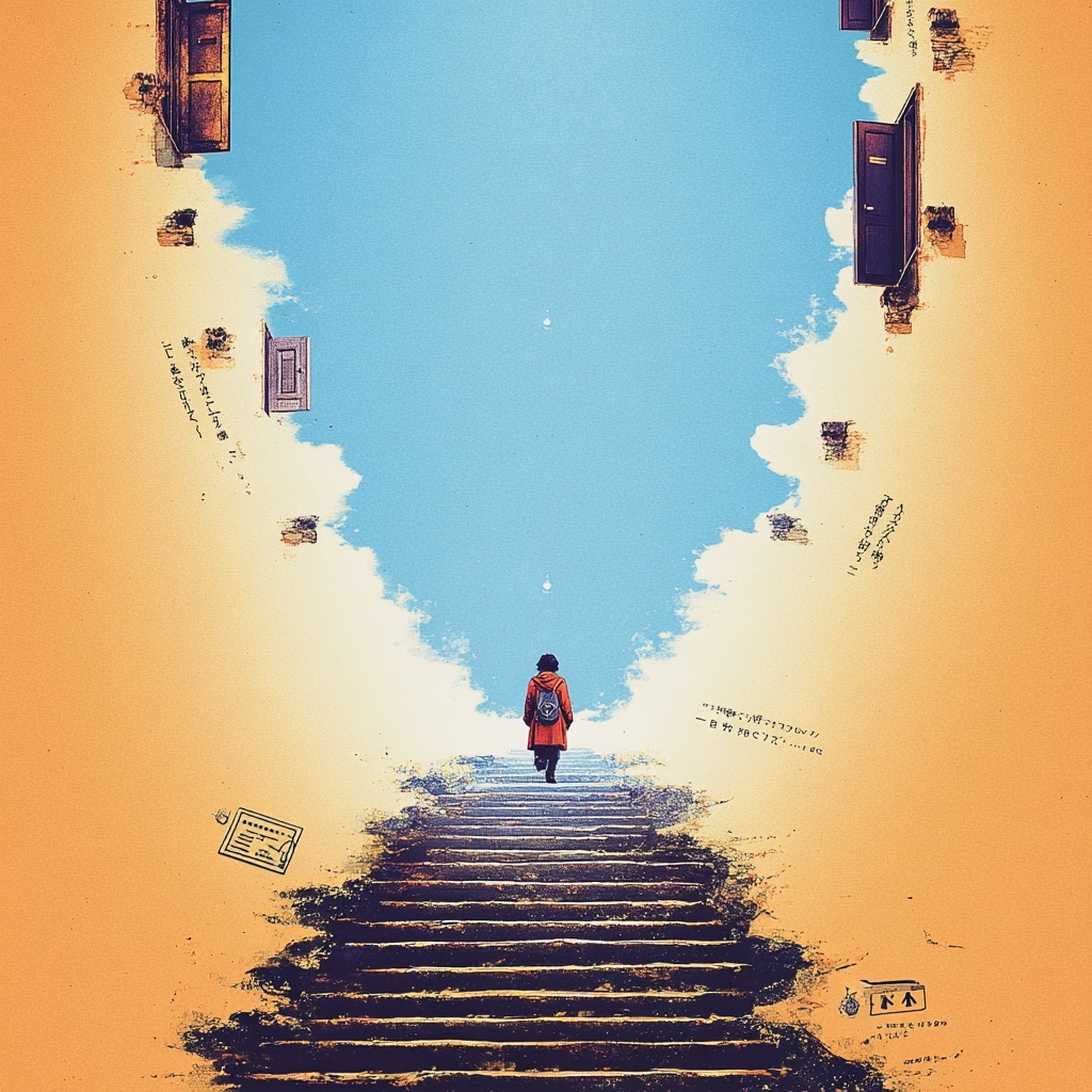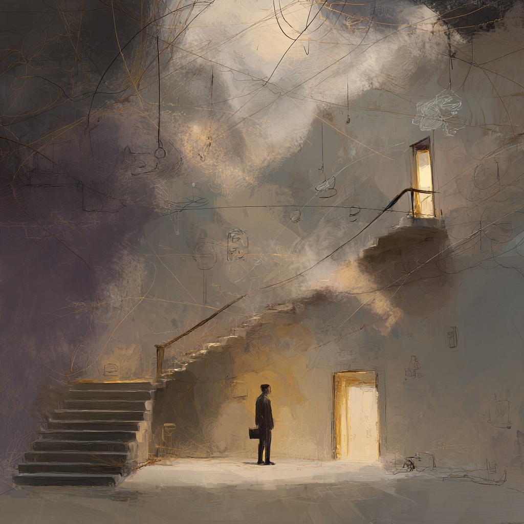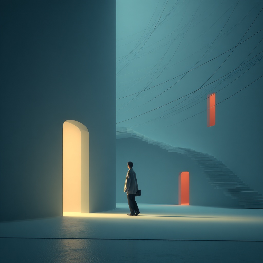 An introspective surreal style where a lone figure drifts through dreamlike spaces of fragmented memories—floating staircases, doorways, and thought-forms—blurring the boundary between reality and imagination.