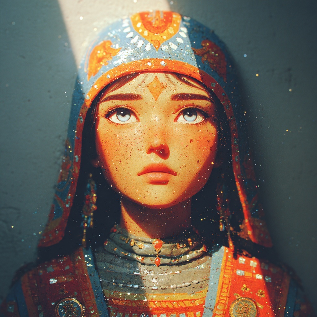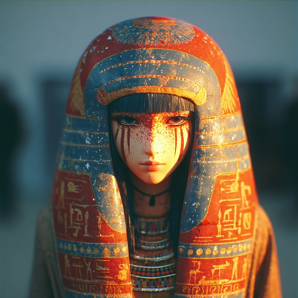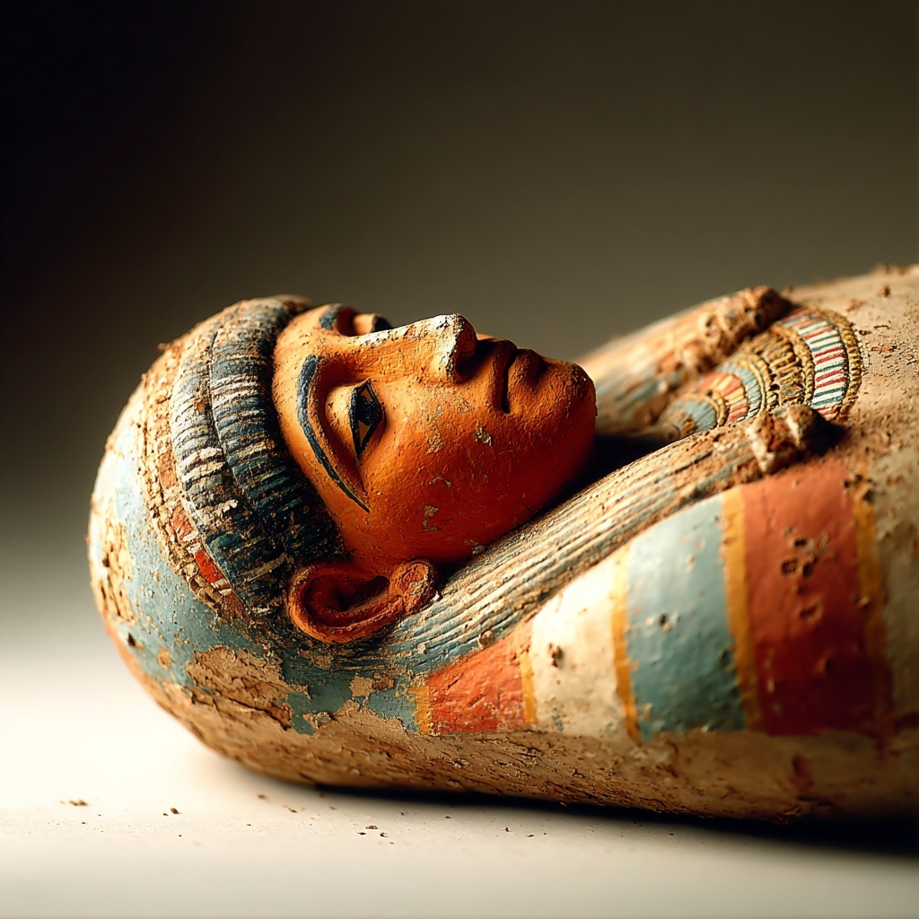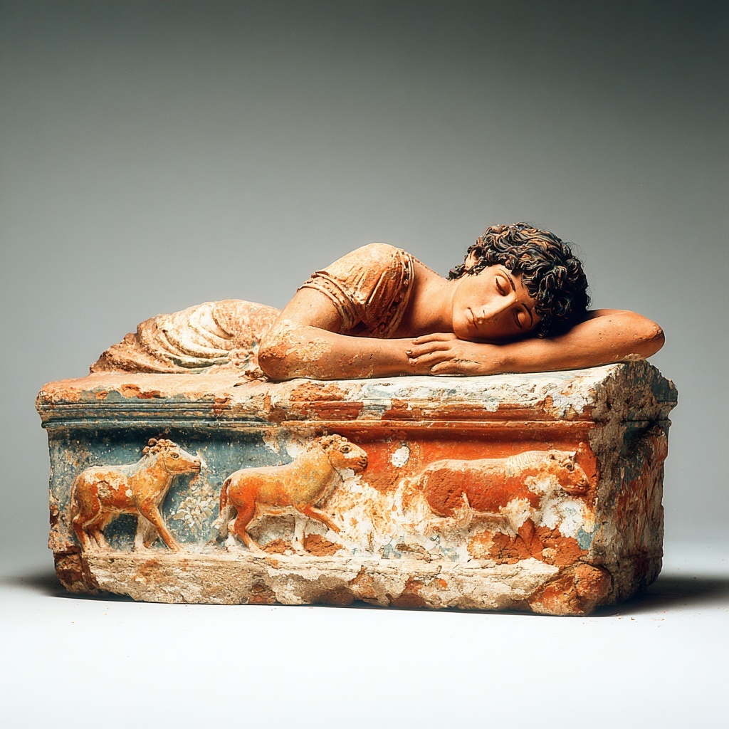 The Etruscan Sarcophagus style transforms it into the reclining lid figure of an Etruscan terracotta sarcophagus.