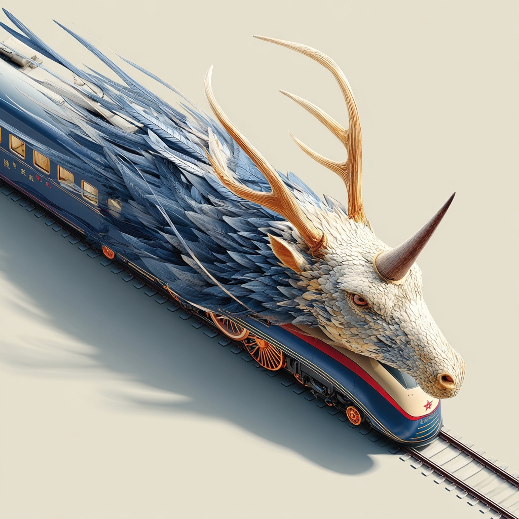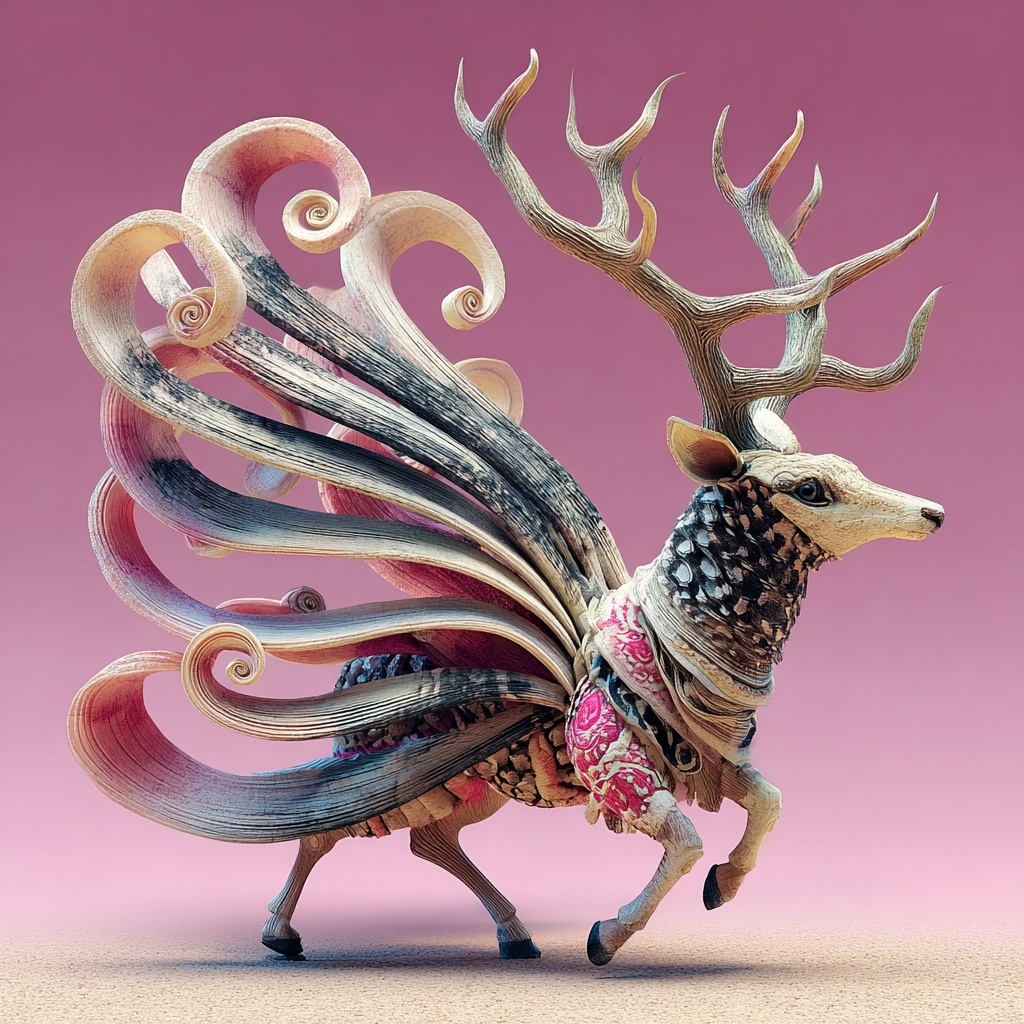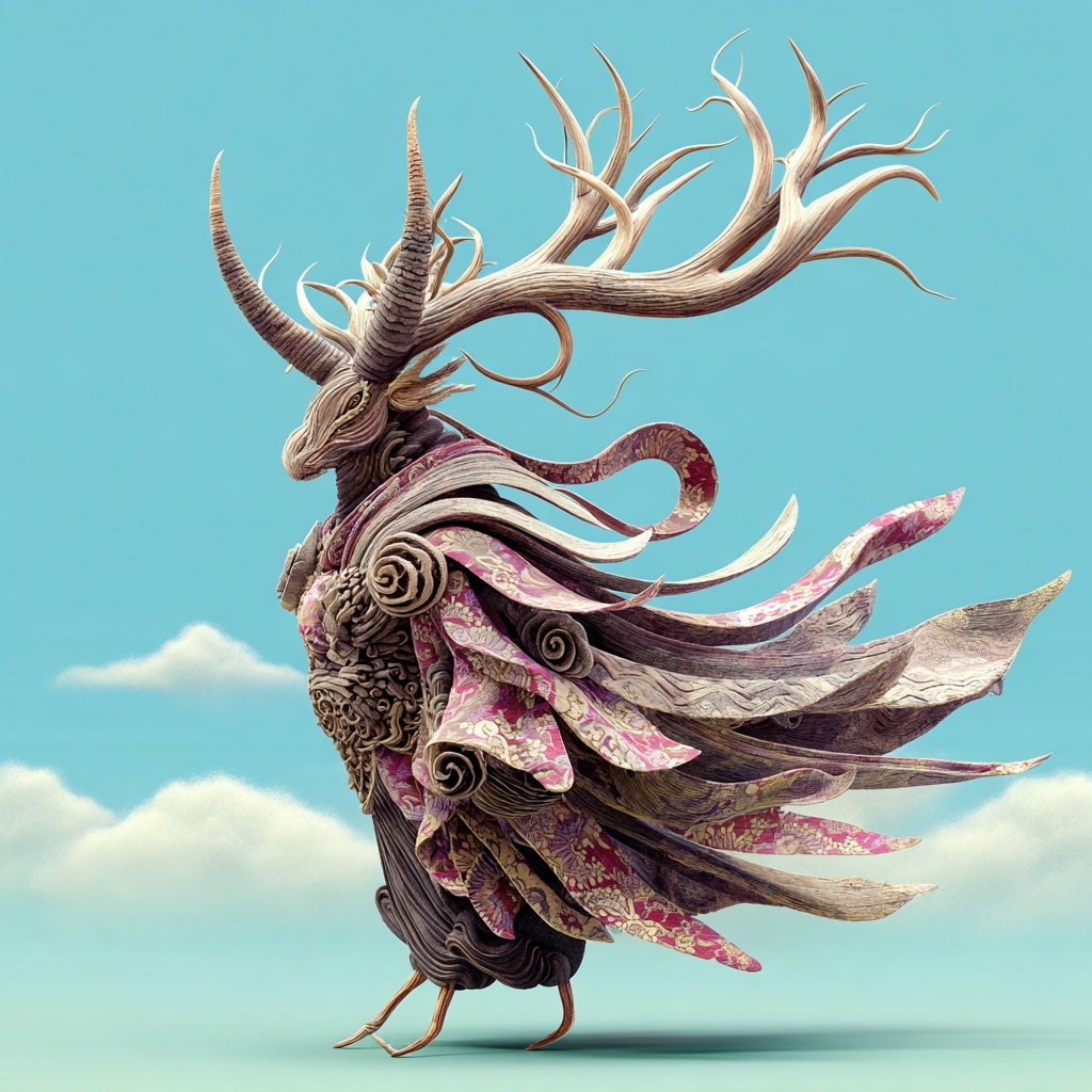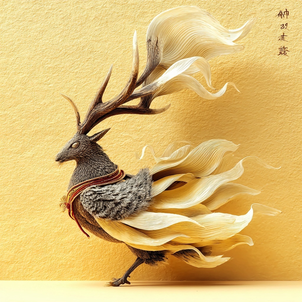 Fei Lian (飞廉) is a wind beast from the Shan Hai Jing—antlers, feathered wings, and a body wrapped in spiraling gusts.
