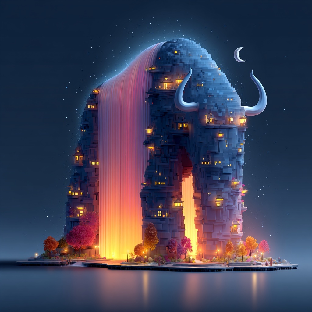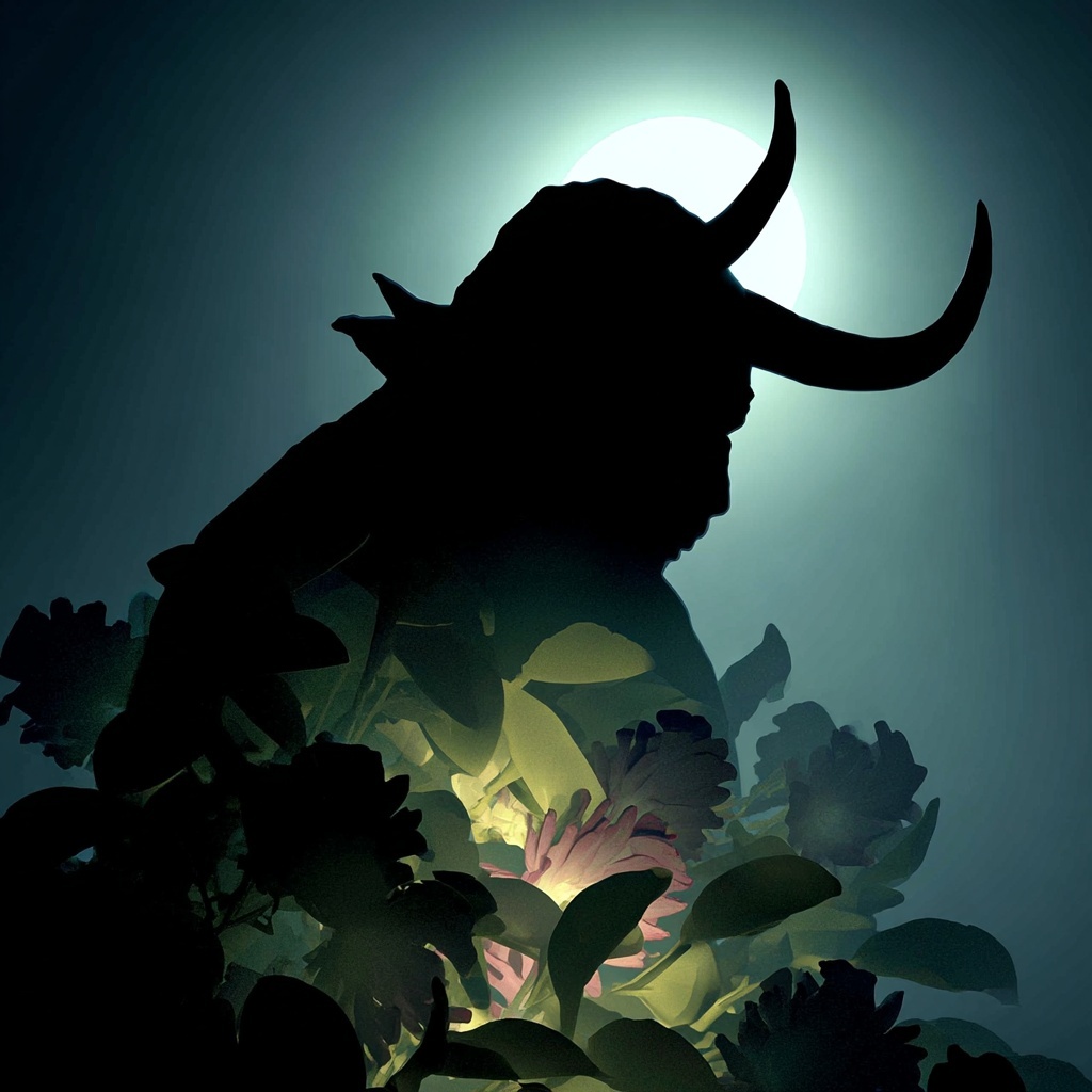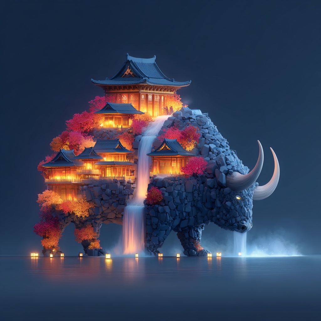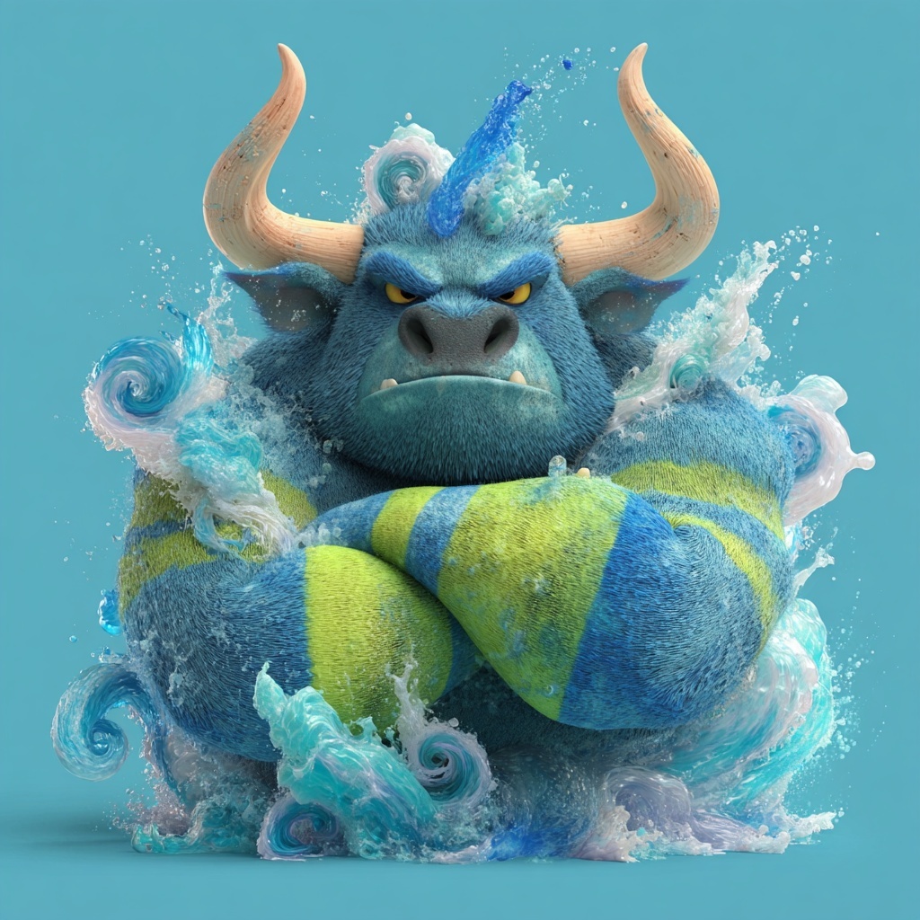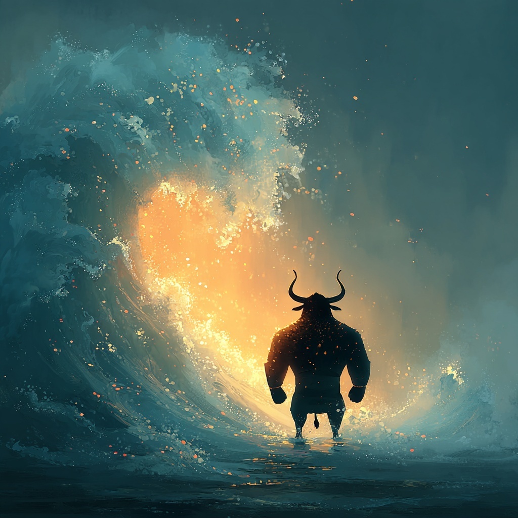 Gonggong (共工) is a flood deity from the Shan Hai Jing—ox head, cracked horn plates, and crashing water coiled around him.