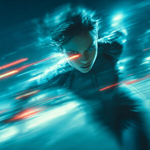 The Future Fugitive style transforms the subject into a futuristic fugitive immersed in the high-tech urban chase scene from Minority Report.