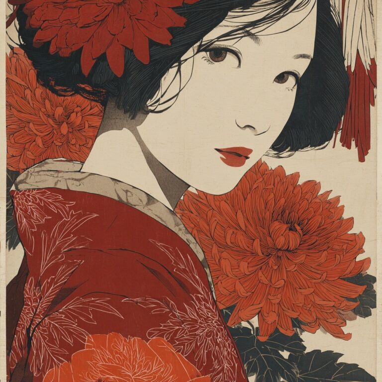 A classical Japanese woodblock print aesthetic characterized by bold outlines, flat color layers, and elegant compositions.