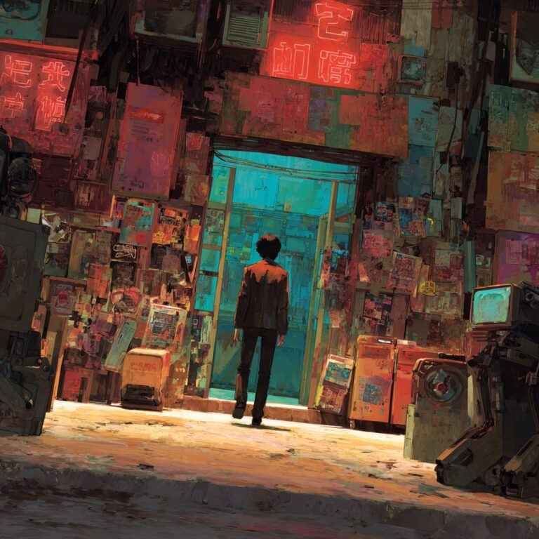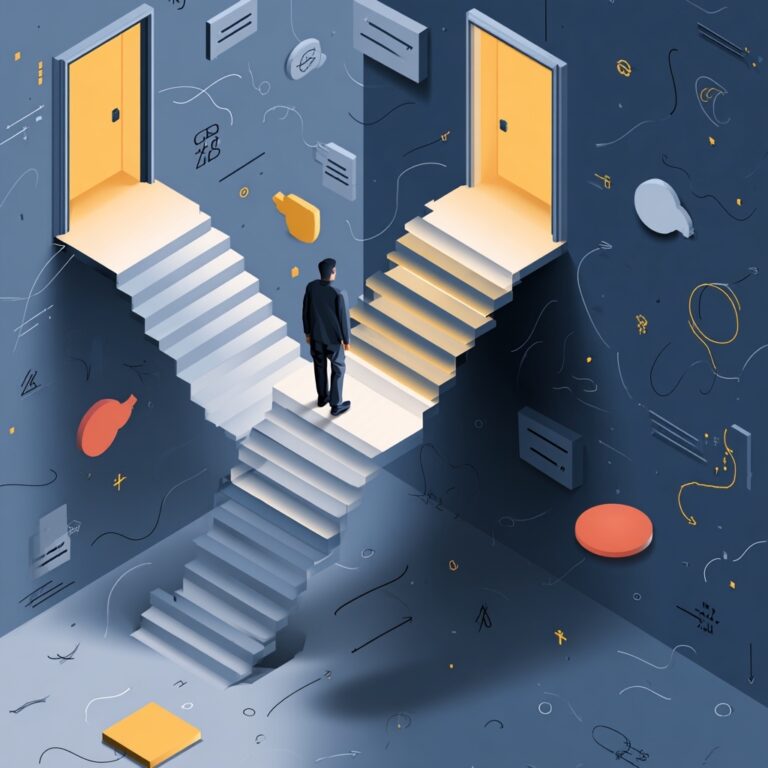 An introspective surreal style where a lone figure drifts through dreamlike spaces of fragmented memories—floating staircases, doorways, and thought-forms—blurring the boundary between reality and imagination.