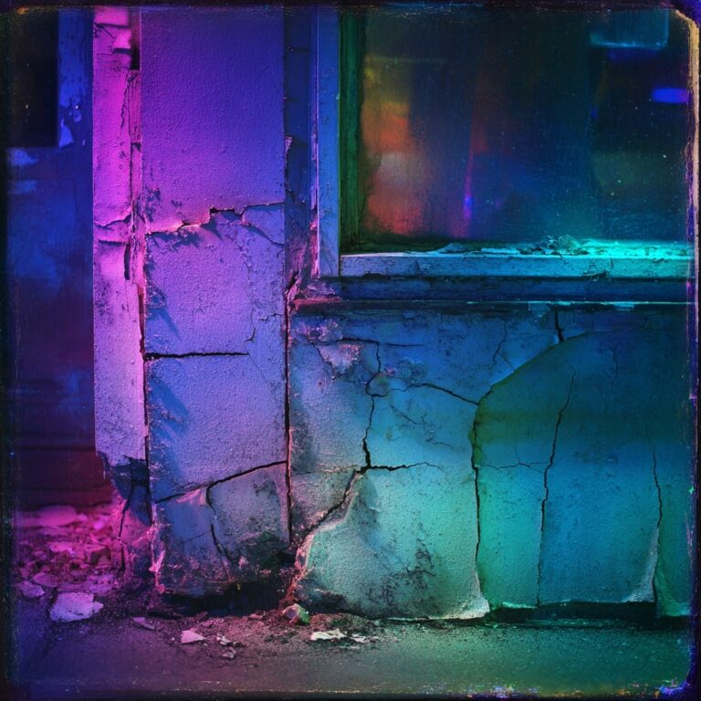 A retro-futuristic blacklight aesthetic where cracked surfaces glow with toxic neons and eerie purples, blending decay and electric vibrance into a hauntingly chaotic visual.