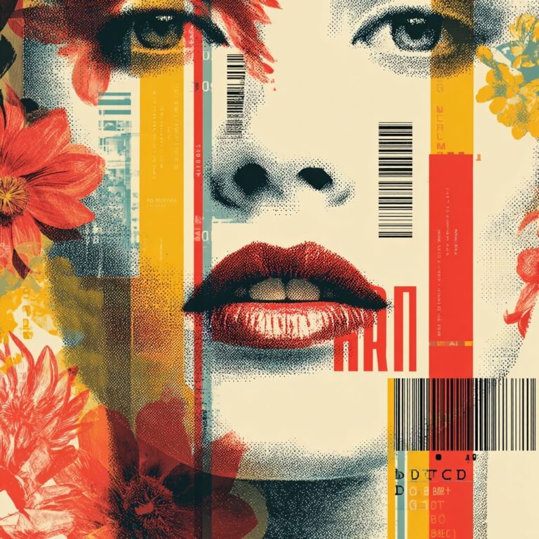 A fusion of humanity and data, where faces, objects, and nature are interwoven with barcode strips and digital glitches. It reflects the tension between individuality and commodification in a world of constant scanning and surveillance.