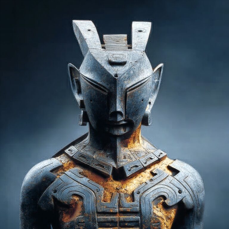 This style draws from the mysterious bronze masks and statues of the Sanxingdui civilization. Figures take on elongated faces, exaggerated eyes, and angular geometric forms, often with ritualistic headdresses and abstract motifs.