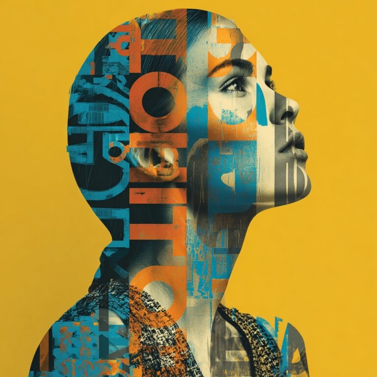 This style creates portraits layered with text, letters, and symbols, turning the body into a typographic canvas with bold patterns, vibrant colors, and structured layouts. Ideal for editorial visuals, experimental art, or designs merging language with identity.
