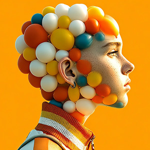 This style reshapes subjects with glossy, balloon-like forms that resemble playful sculptures or elaborate headpieces.