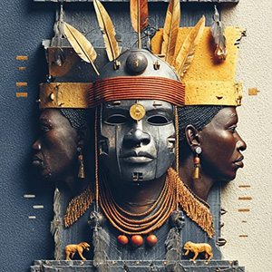 The Benin Bronze style transforms the subject into a high-relief Benin Court bronze plaque.