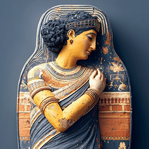 The Etruscan Sarcophagus style transforms it into the reclining lid figure of an Etruscan terracotta sarcophagus.