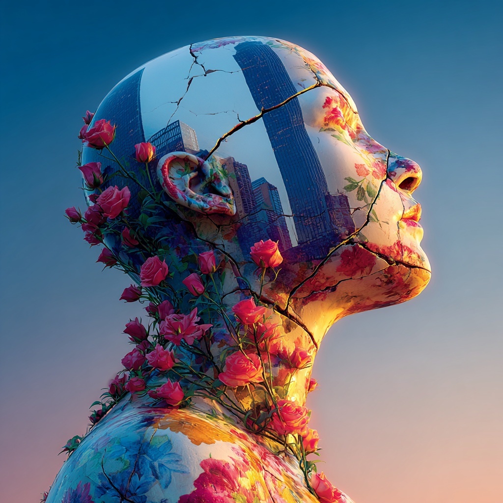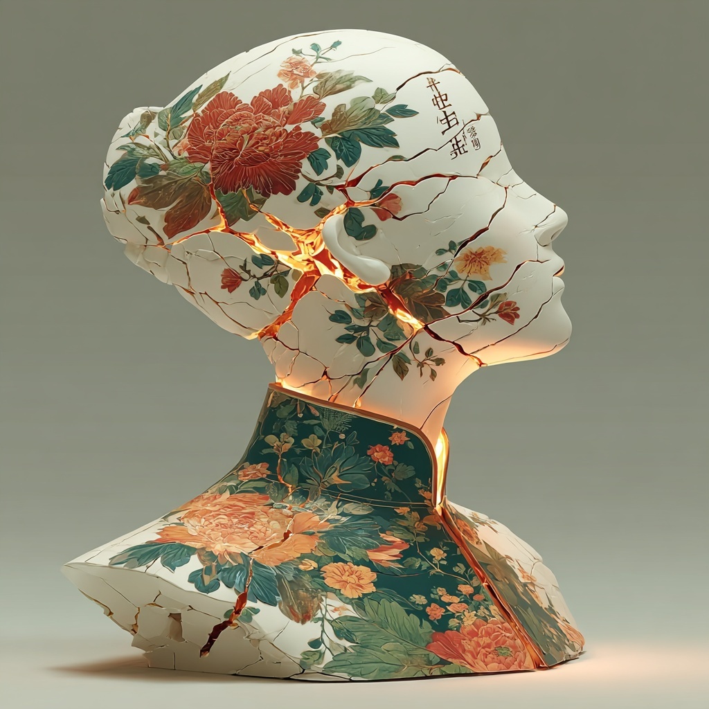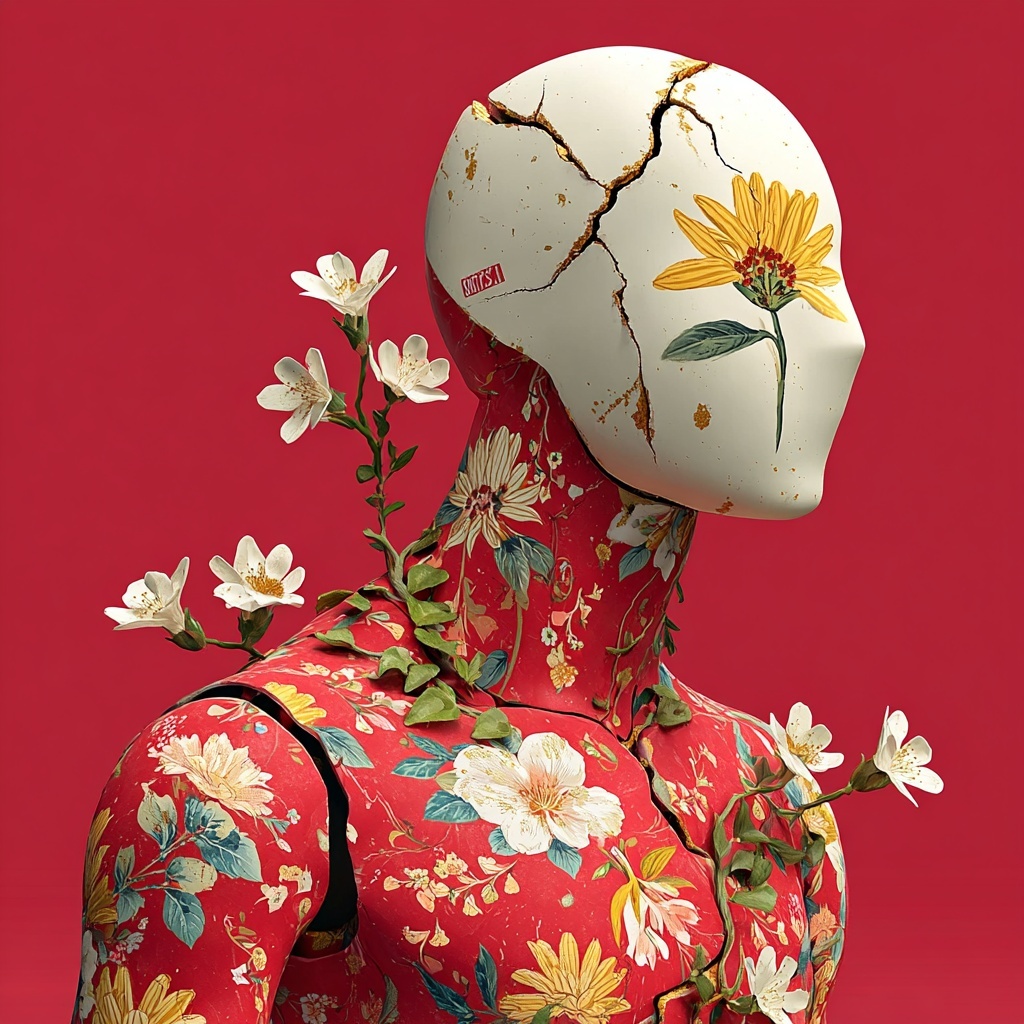 This style transforms subjects into cracked porcelain figures adorned with painted florals and blooming plants.