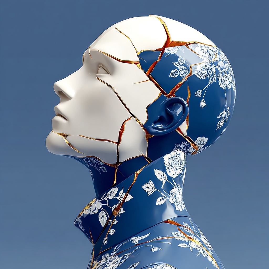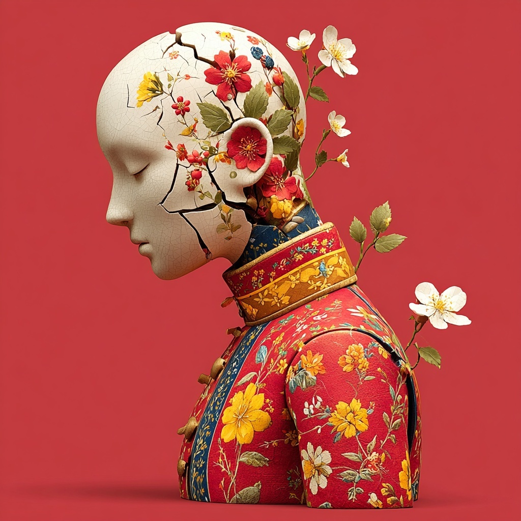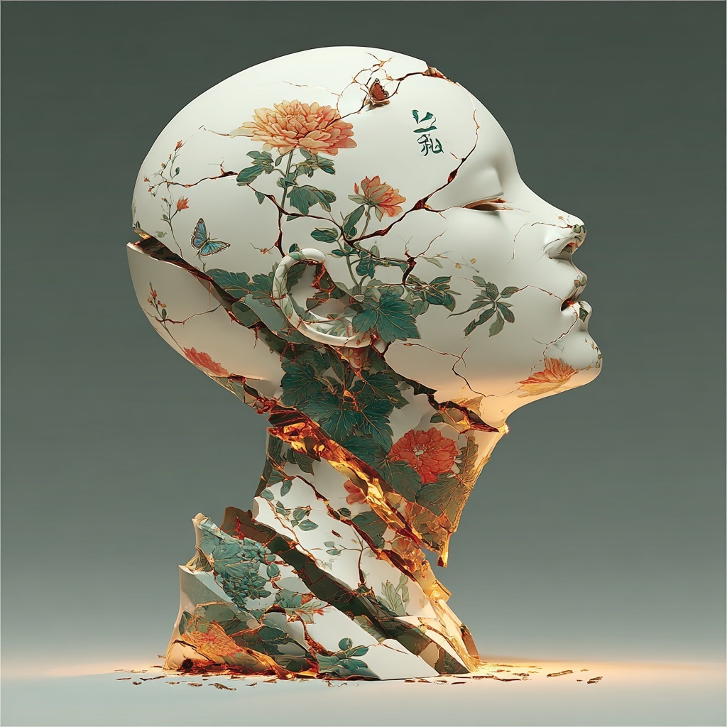 This style transforms subjects into cracked porcelain figures adorned with painted florals and blooming plants.