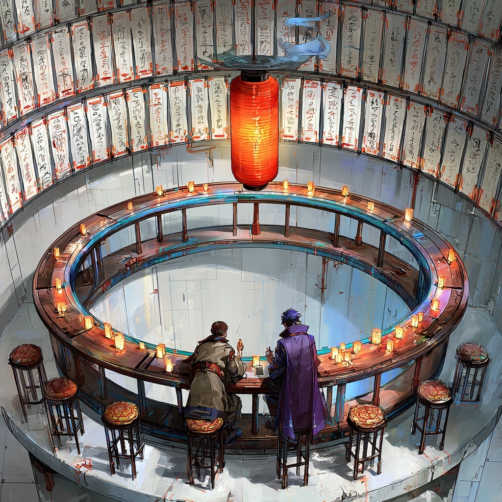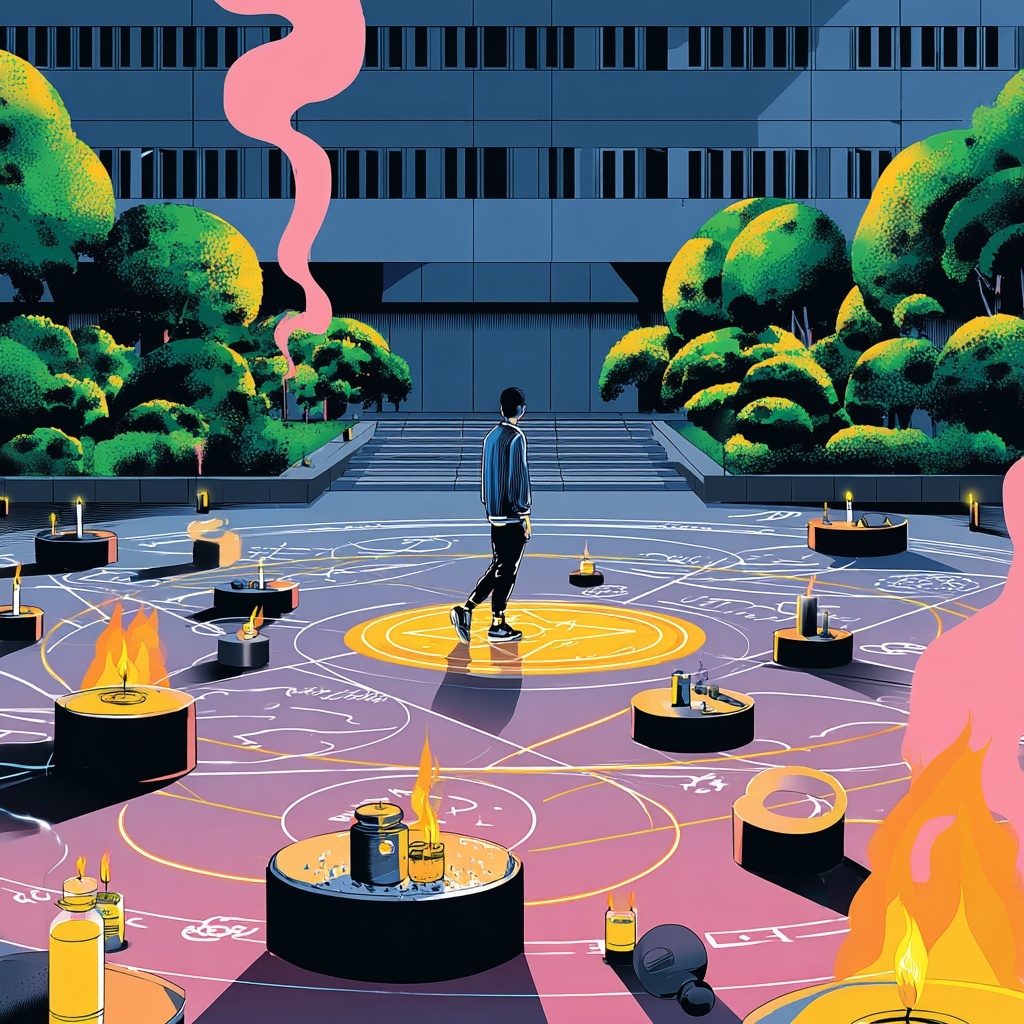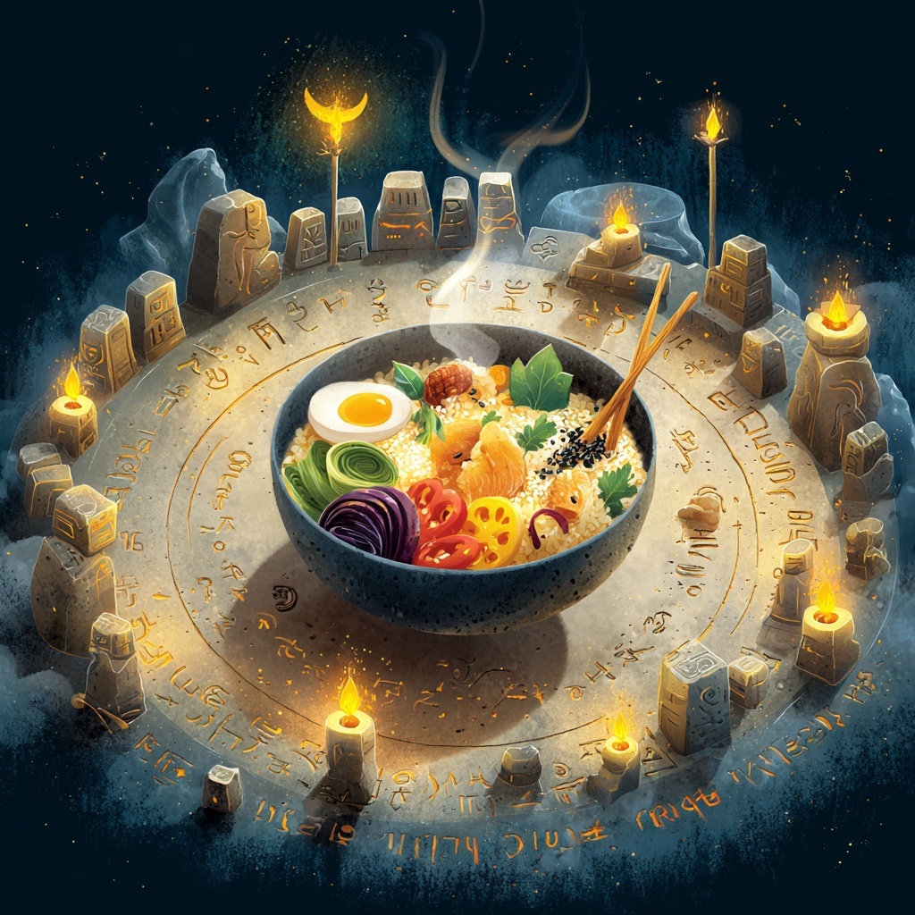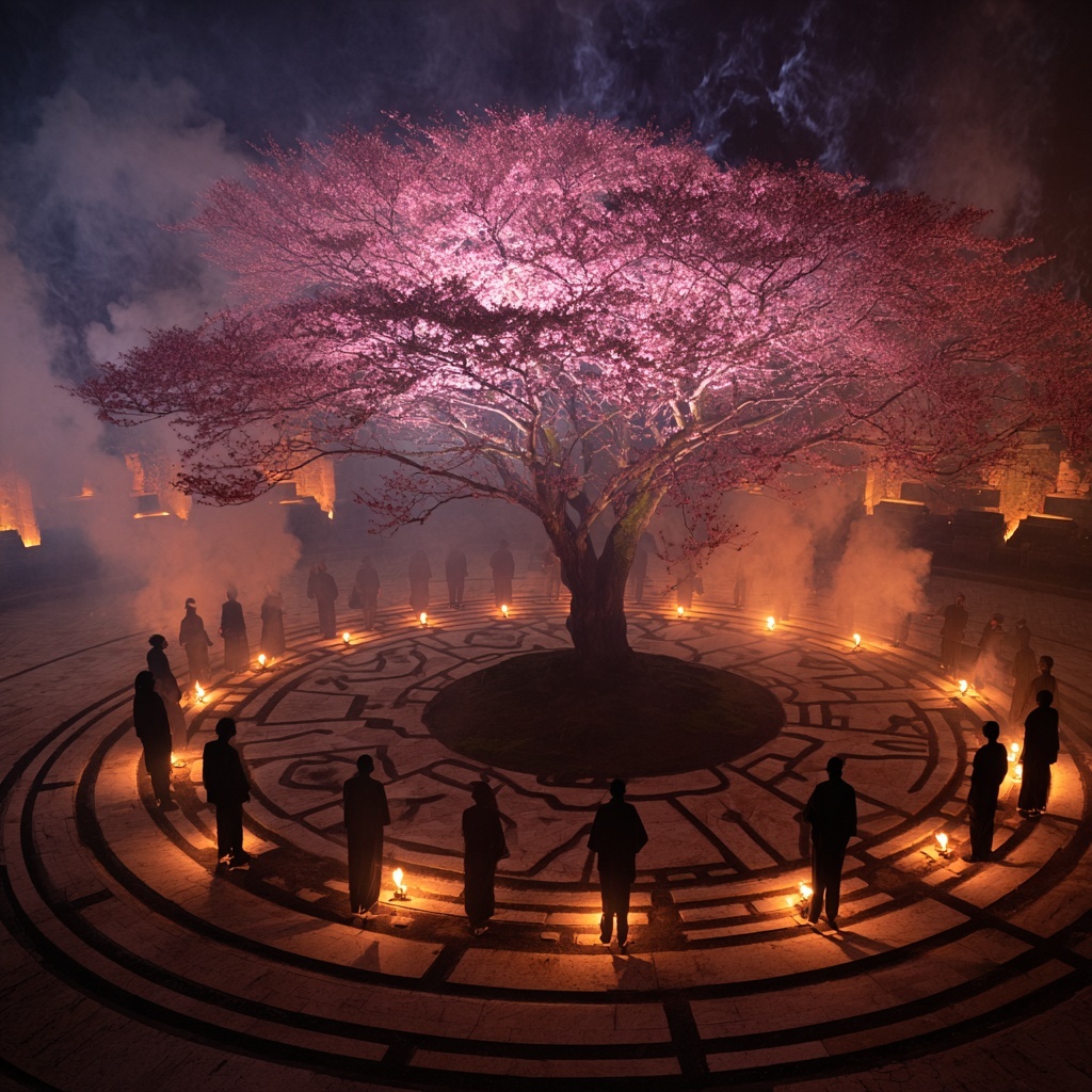 A mystical ceremonial Ritual Echo style where subjects are arranged in circular symmetry, glowing with torchlight or glyphs. The atmosphere is sacred, timeless, and mysterious, echoing ritualistic reverence.