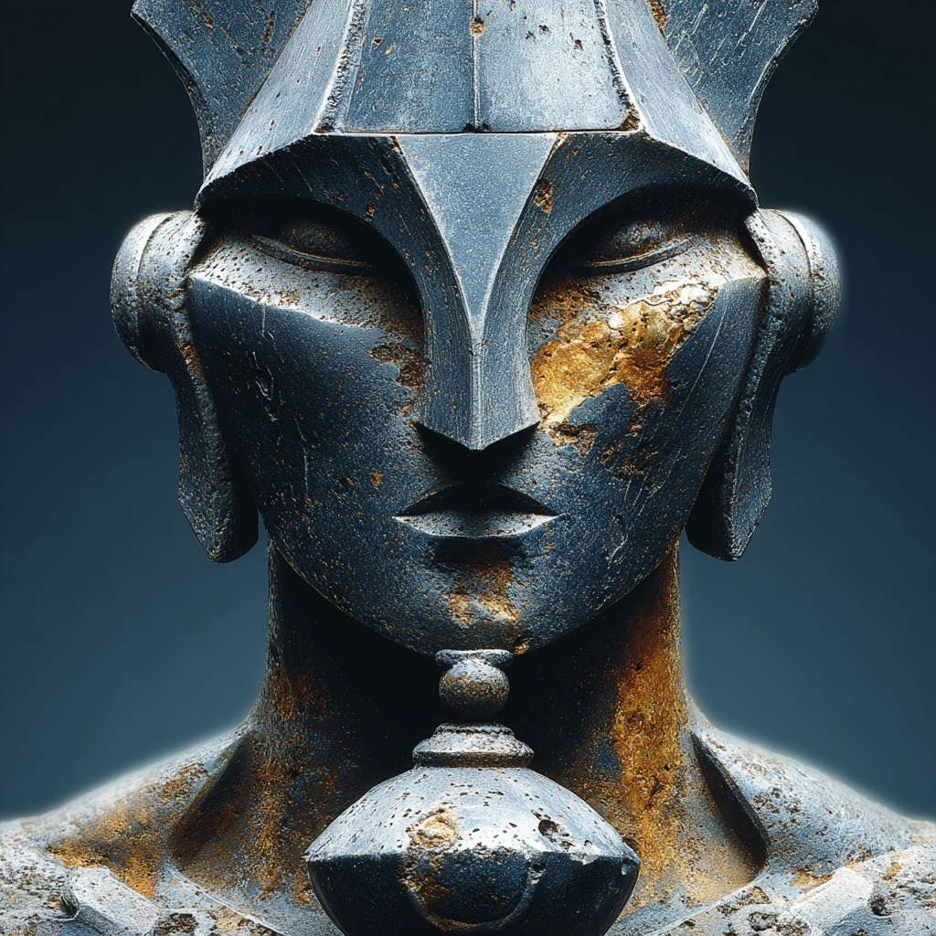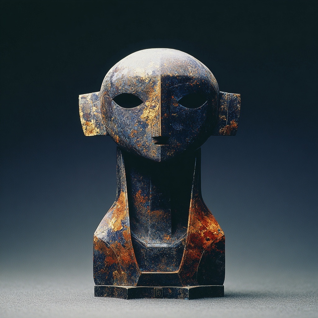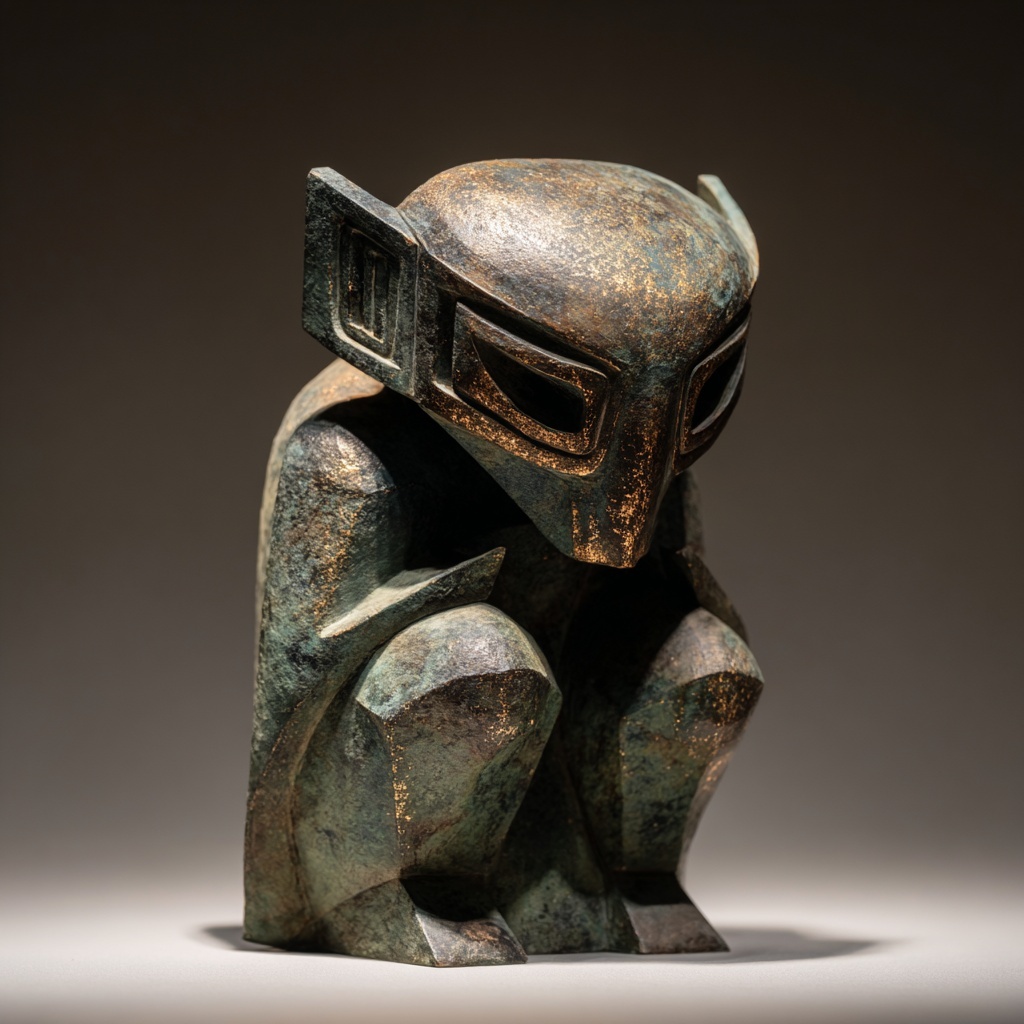 This style draws from the mysterious bronze masks and statues of the Sanxingdui civilization. Figures take on elongated faces, exaggerated eyes, and angular geometric forms, often with ritualistic headdresses and abstract motifs.