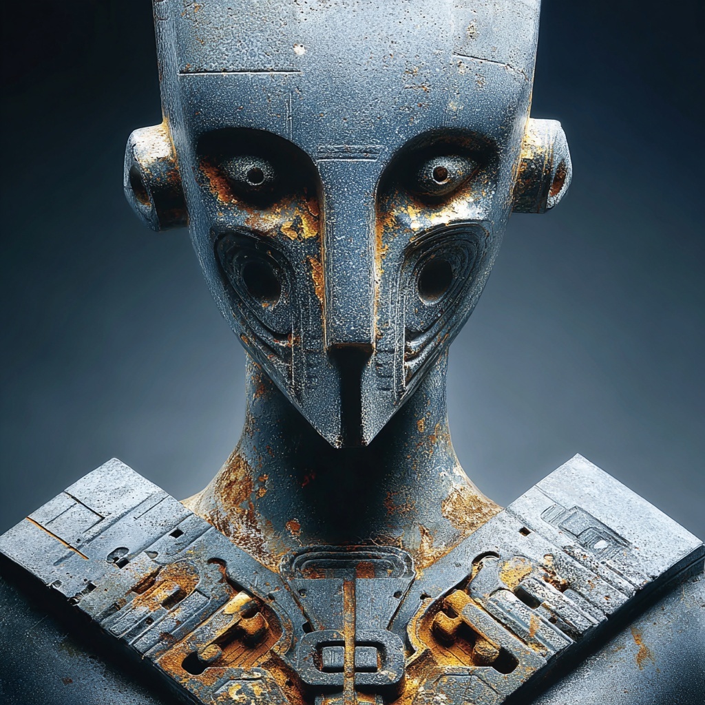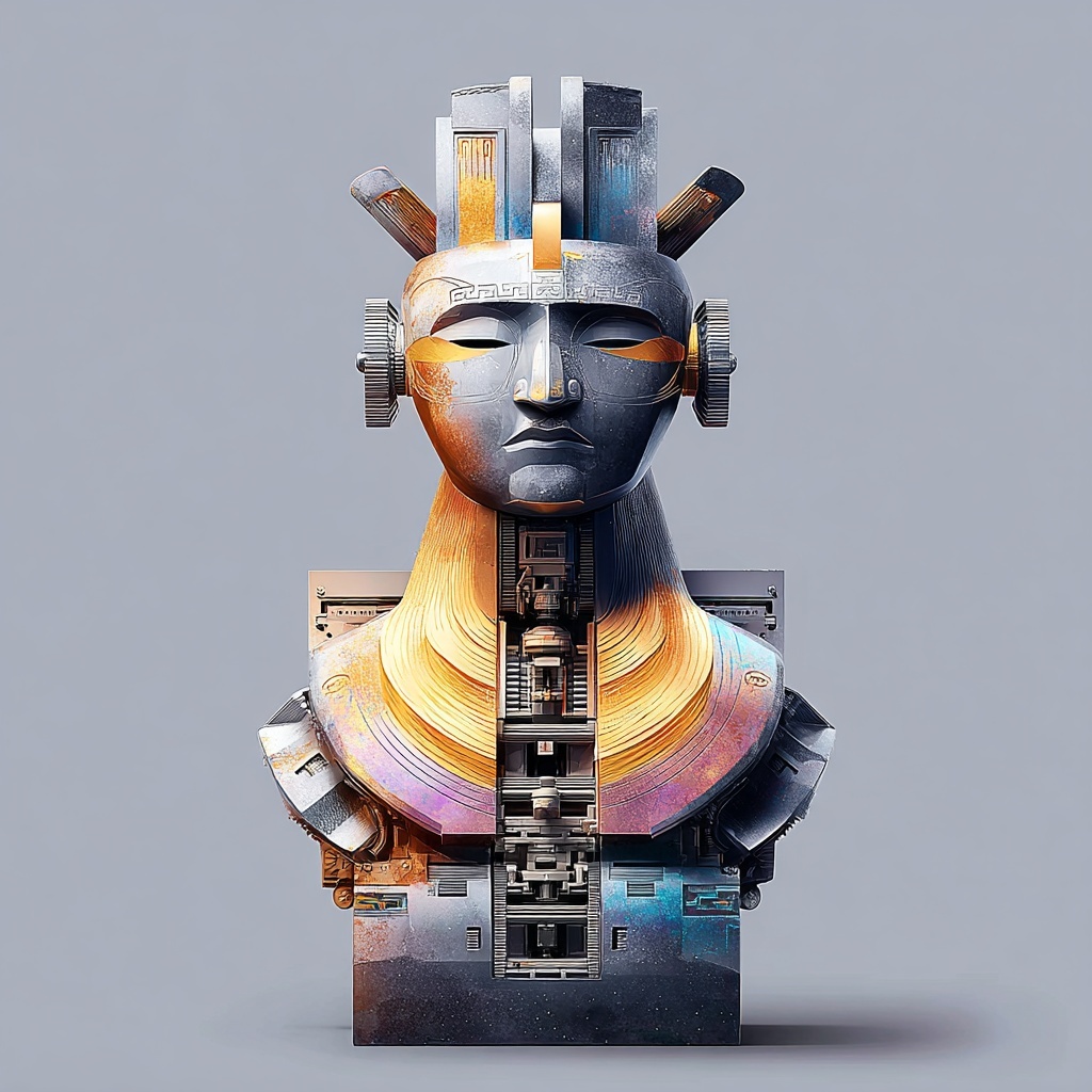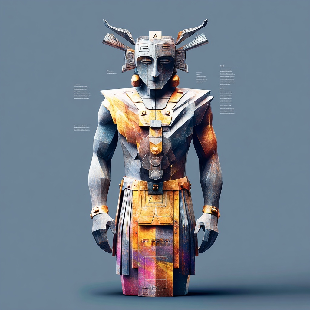 This style draws from the mysterious bronze masks and statues of the Sanxingdui civilization. Figures take on elongated faces, exaggerated eyes, and angular geometric forms, often with ritualistic headdresses and abstract motifs.